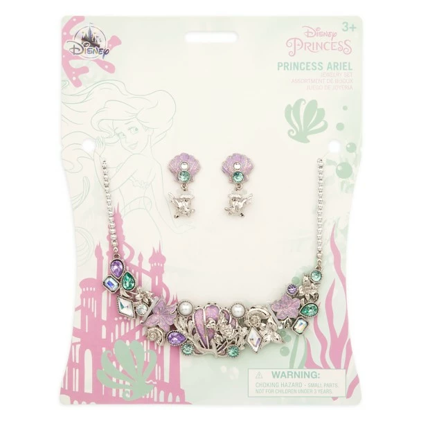 Shower treasures untold on any Little Mermaid outfit with this breathtaking jewelry set designed to complement our Ariel costume collection. A silvery necklace with sea life filigree, faceted gems, and faux pearls, is matched by shell earrings with Flounder bobs.