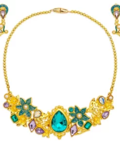 Grant an extra wish to any Jasmine outfit with this breathtaking jewelry set designed to complement our costume collection. A golden necklace with floral filigree, faceted gems, and faux pearls, is matched by earrings with magic lamp bobs.