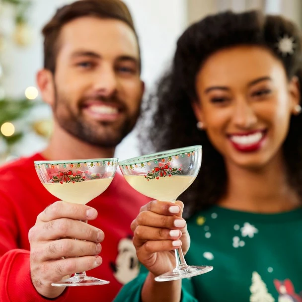Mickey will brighten up holiday meal times with this pair of dessert glasses circled with a string of colored lights. Decorative bows and sprigs of holly are accented with little red Mickey icons, making a sweet addition to your festive table.