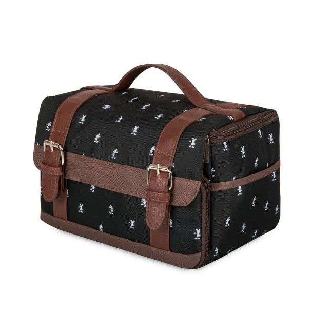 This Mickey Mouse lunch tote has all the ingredients to make meal times magical. The tasteful design features an allover Mickey silhouette print, faux leather trim, and a front pocket that unzips to reveal a deluxe service for one.