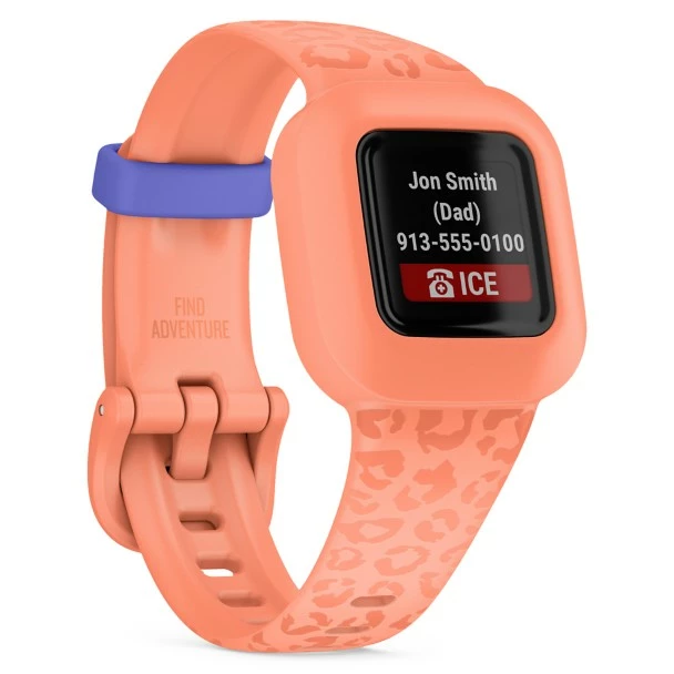 Featuring a colorful display and Peach Leopard print design, this kid-tough, swim-friendly vívofit jr. 3 fitness tracker can uncover educational, globe-trotting app adventures and mini games on the parent-controlled smartphone app by completing 60 minutes of daily activity.