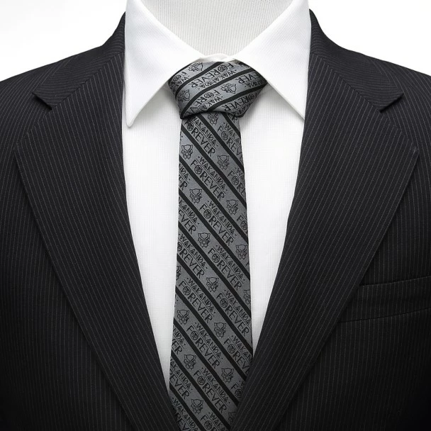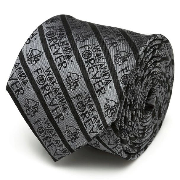 A dusky gray forms the background for this silk tie that features the logo of the Black Panther throughout its diagonal stripes. Stylized letters stamp out the words ”Wakanda Forever” in neat rows, ensuring this tie becomes part of your favorite formal look.