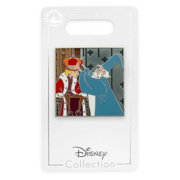 And so it was decreed ”Whoso pulleth out this sword of this stone and anvil, is rightwise King born of all England.” Young King Arthur, also known as ”the Wart,” fulfills his destiny as mentor Merlin the wizard bestows the Crown on this story-rich cloisonné pin.